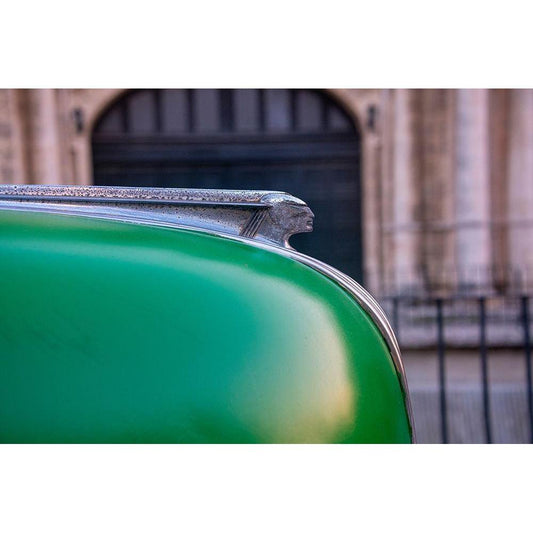 Detail of hood ornament on green classic American Pontiac car in Habana-Havana-Cuba White Modern Wood Framed Art Print by Miglavs, Janis