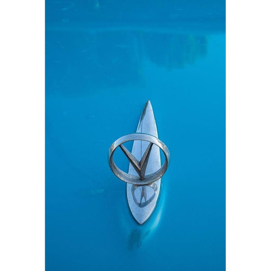Detail of hood ornament on a classic blue American car in Vieja-old Habana-Havana-Cuba White Modern Wood Framed Art Print by Miglavs, Janis