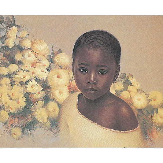 Girl and Yellow Flowers Gold Ornate Wood Framed Art Print with Double Matting by Unknown