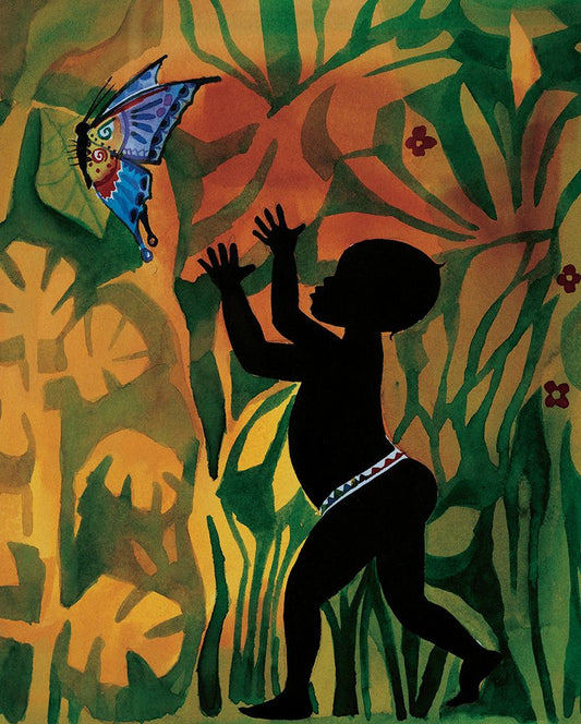 Boy Chasing Butterfly Black Modern Wood Framed Art Print by Unknown