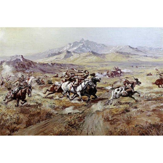 Stagecoach Attack Black Modern Wood Framed Art Print by Russell, Charles M.