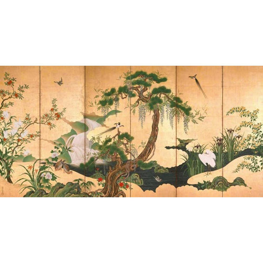 Birds and Flowers of Spring and Summer Black Modern Wood Framed Art Print by Eino, Kano