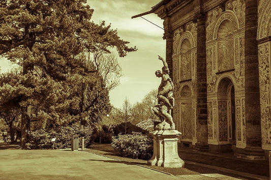 Ball Game Hall And Sculpture Night in Prague Black Ornate Wood Framed Art Print with Double Matting by Jenny Rainbow Fine Art