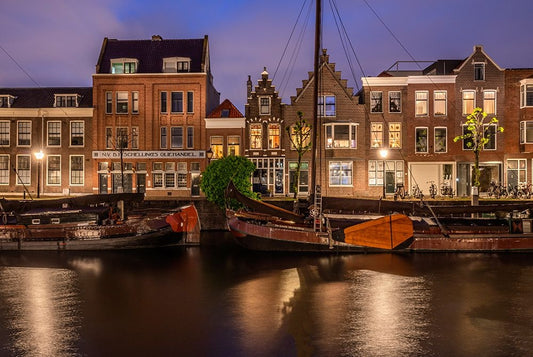 Europe-The Netherlands-Delfshaven-Sunset scene along canal White Modern Wood Framed Art Print with Double Matting by Jaynes Gallery