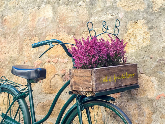 Italy-Tuscany-Monticchiello Bicycle with bright pink heather in the basket White Modern Wood Framed Art Print with Double Matting by Eggers, Julie