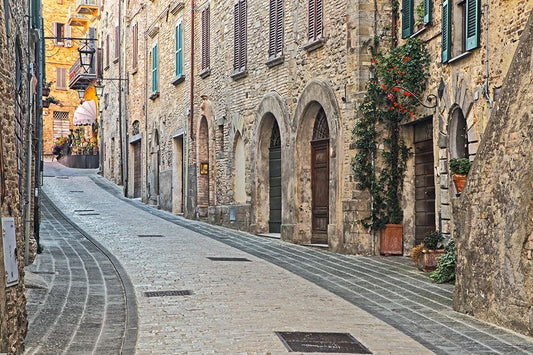 Italy- Umbria. Vintage look of a street in the historic town of Montone. White Modern Wood Framed Art Print with Double Matting by Eggers, Julie