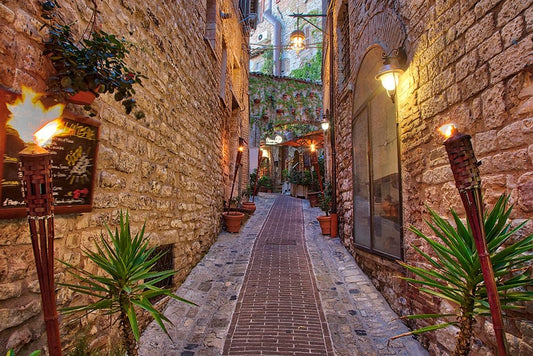 Italy- Umbria. Street lined with flower pots in the town of Assisi. White Modern Wood Framed Art Print with Double Matting by Eggers, Julie