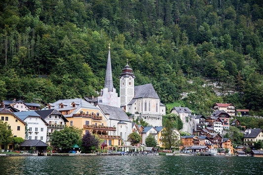 Austria-Hallstatt-Town of Hallstatt as seen from Lake Hallstatt White Modern Wood Framed Art Print with Double Matting by Looney, Hollice