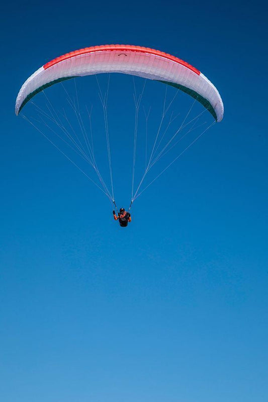 Austria-Dachstein-Paraglider soaring above Lake Hallstatt and the surrounding mountains White Modern Wood Framed Art Print with Double Matting by Looney, Hollice