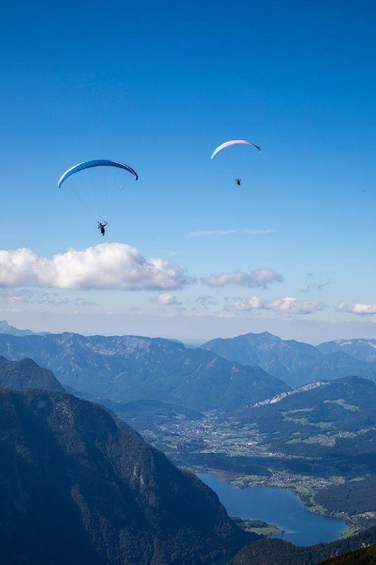 Austria-Dachstein-Paragliders as they soar above Lake Hallstatt and the surrounding mountains White Modern Wood Framed Art Print with Double Matting by Looney, Hollice