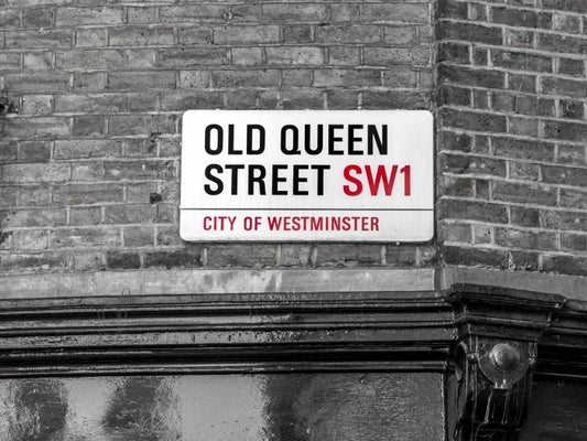 Old Queen street signboard, London, UK White Modern Wood Framed Art Print with Double Matting by Frank, Assaf