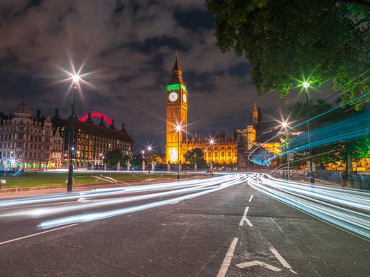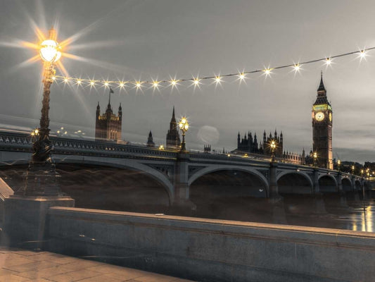 Westminster Abby and Big Ben with strip lights, London, UK White Modern Wood Framed Art Print with Double Matting by Frank, Assaf