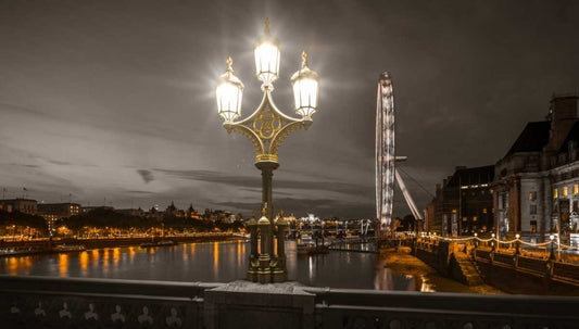 Street lamp on Westminster Bridge with London Eye in background, London, UK White Modern Wood Framed Art Print with Double Matting by Frank, Assaf