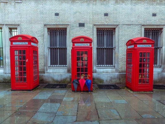 Telephone boxes with umbrellas White Modern Wood Framed Art Print with Double Matting by Frank, Assaf