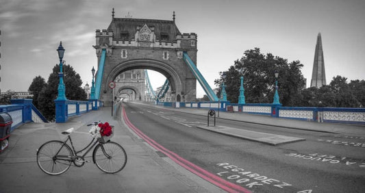 Bunch of roses on a bicycle near Tower Bridge, London, UK White Modern Wood Framed Art Print with Double Matting by Frank, Assaf