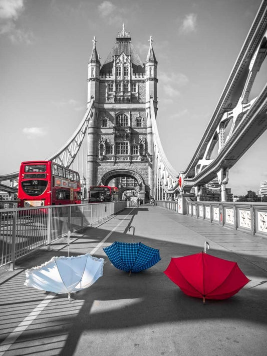 Colorful umbrellas on Tower bridge, London, UK White Modern Wood Framed Art Print with Double Matting by Frank, Assaf
