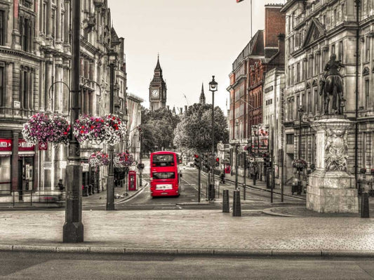 Streets of London city with double decker bus, UK White Modern Wood Framed Art Print with Double Matting by Frank, Assaf