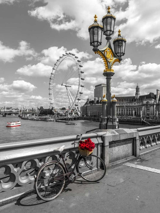 Bicycle with bunch of flowers on Westminster Bridge, London, UK White Modern Wood Framed Art Print with Double Matting by Frank, Assaf