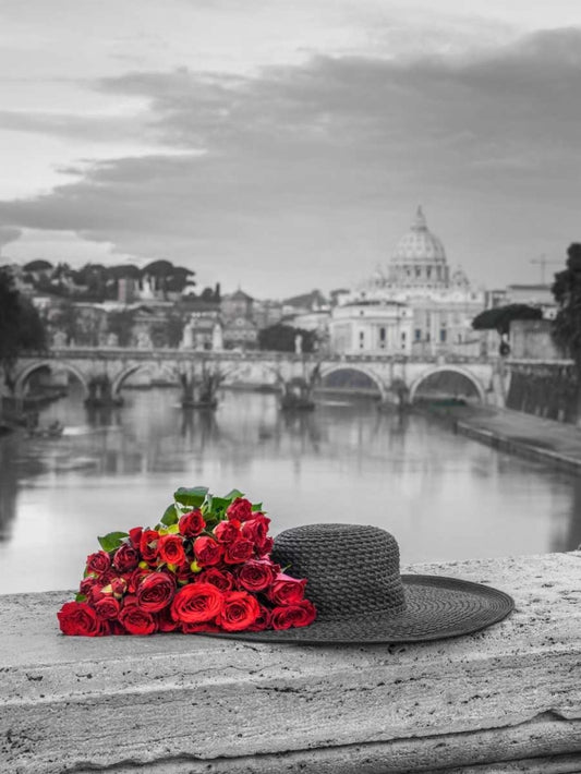 Hat and bunch of roses on bridge with Basilica di San Pietro in Vatican, Rome, Italy White Modern Wood Framed Art Print with Double Matting by Frank, Assaf