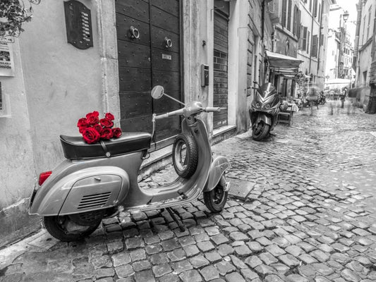 Old scooter with bunch of roses on narrow street of Rome White Modern Wood Framed Art Print with Double Matting by Frank, Assaf