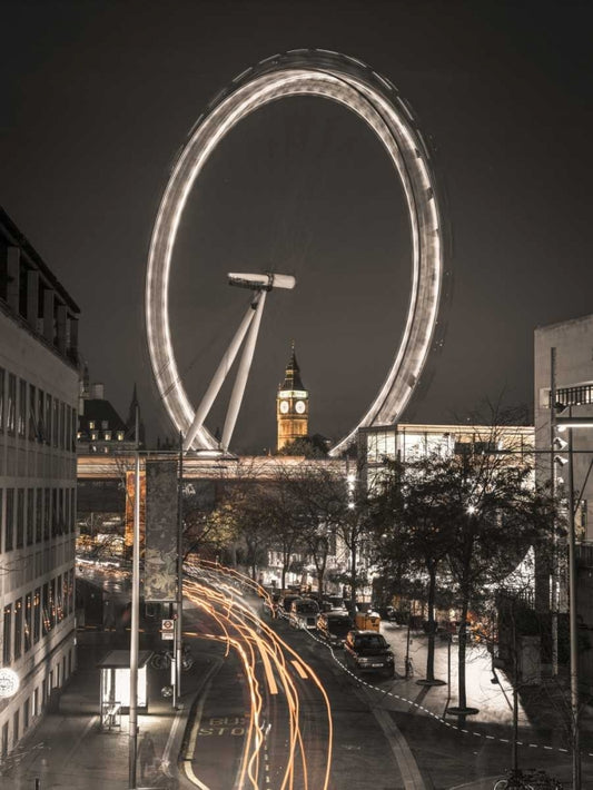 Night shot of London street with Millennium wheel in background White Modern Wood Framed Art Print with Double Matting by Frank, Assaf