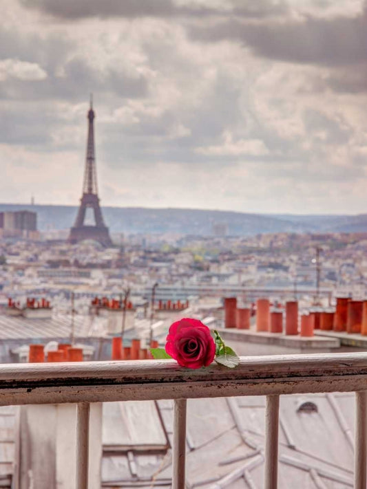 Rose on balcony railing with Eiffel Tower in background, Paris, France White Modern Wood Framed Art Print with Double Matting by Frank, Assaf