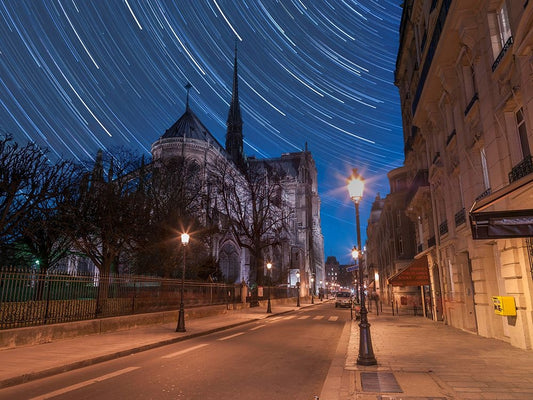 Star Trails above Notre-Dame de Paris White Modern Wood Framed Art Print with Double Matting by Frank, Assaf