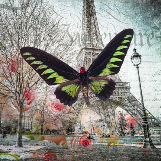 Eiffel tower with butterfly and roses overlay White Modern Wood Framed Art Print with Double Matting by Frank, Assaf