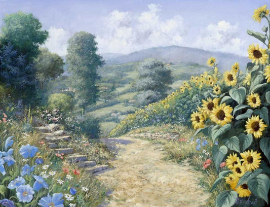 Along the sunflowers White Modern Wood Framed Art Print with Double Matting by Motz, Peter