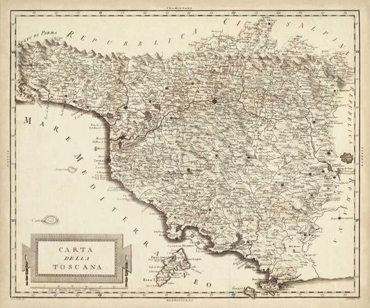 Antique Map of Tuscany White Modern Wood Framed Art Print with Double Matting by Unknown