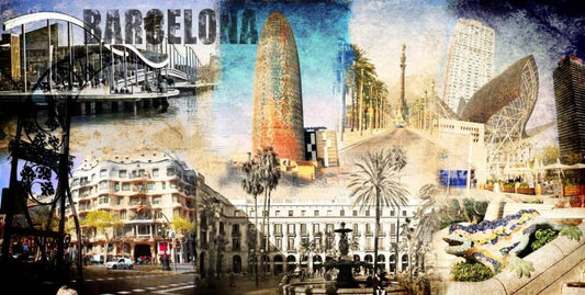 Barcelona Collage 01 White Modern Wood Framed Art Print with Double Matting by Adamsky