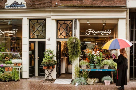 Amsterdam Storefront White Modern Wood Framed Art Print with Double Matting by Berzel, Erin