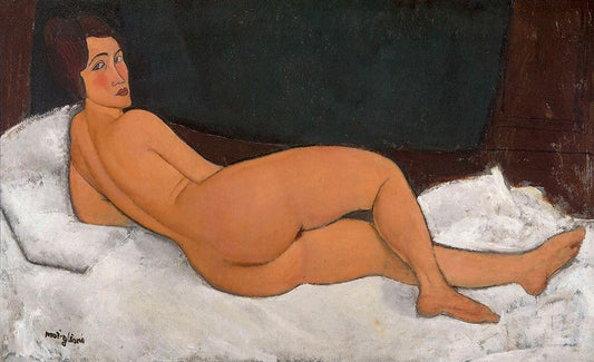 Reclining Nude looking over right shoulder White Modern Wood Framed Art Print with Double Matting by Modigliani, Amedeo