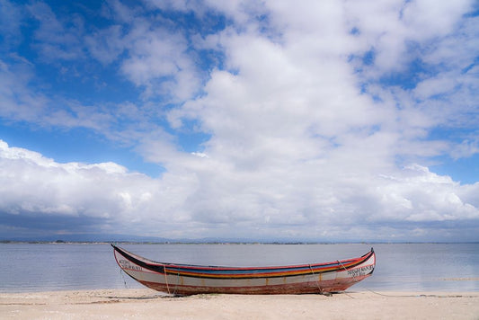 Europe-Portugal-Torreira-Traditional fishing boat on beach Black Ornate Wood Framed Art Print with Double Matting by Jaynes Gallery