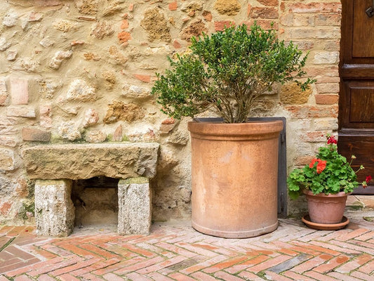 Italy-Tuscany-Pienza Potted plants and stone bench along the streets Black Ornate Wood Framed Art Print with Double Matting by Eggers, Julie