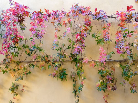 Italy-Tuscany-Pienza Colorful vines hanging on a wall along the streets Black Ornate Wood Framed Art Print with Double Matting by Eggers, Julie