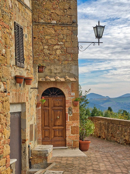 Italy-Tuscany-Pienza Entrance to a home Black Ornate Wood Framed Art Print with Double Matting by Eggers, Julie