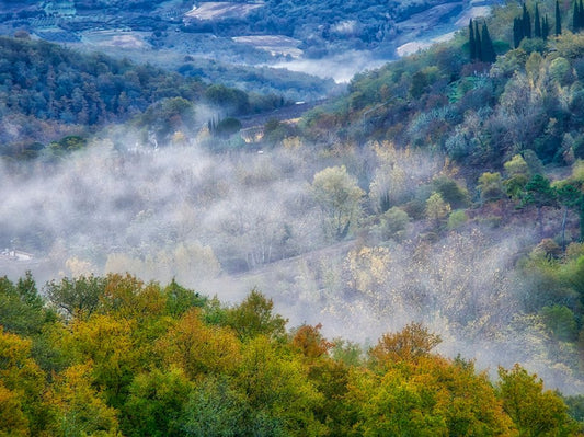 Italy-Tuscany Autumn morning with fog in the Tuscan valley Black Ornate Wood Framed Art Print with Double Matting by Eggers, Julie
