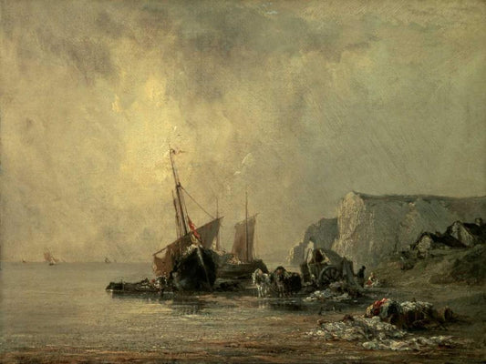 Boats by the Normandy Shore Black Ornate Wood Framed Art Print with Double Matting by Bonington, Richard Parkes