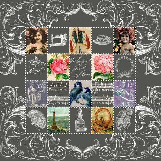 Paris Stamps Grey Black Ornate Wood Framed Art Print with Double Matting by De Lauzun, Marion