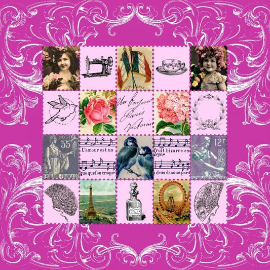 Vintage Stamps Pink Black Ornate Wood Framed Art Print with Double Matting by De Lauzun, Marion