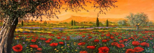 Cypress in poppy field, Tuscany, Italy Black Ornate Wood Framed Art Print with Double Matting by Krahmer, Frank