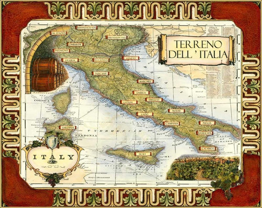 Wine Map of Italy on CGP Black Ornate Wood Framed Art Print with Double Matting by Unknown