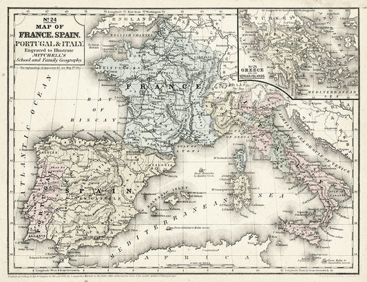Mitchells Map France SpainAnd Italy Black Ornate Wood Framed Art Print with Double Matting by Mitchell