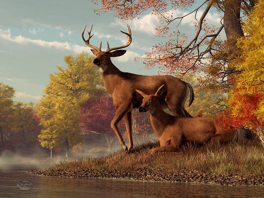 Deer On An Autumn Lakeshore White Modern Wood Framed Art Print with Double Matting by Eskridge, Daniel
