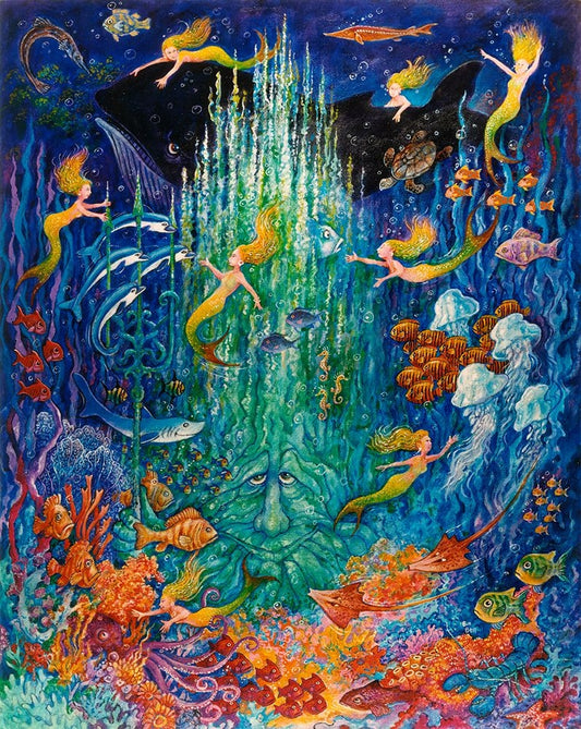 Neptune And The Mermaids White Modern Wood Framed Art Print with Double Matting by Bell, Bill