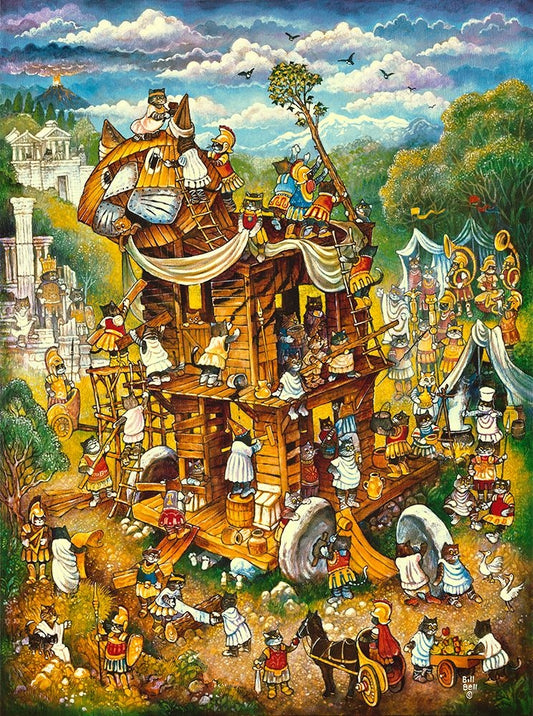 Trojan Cats White Modern Wood Framed Art Print with Double Matting by Bell, Bill