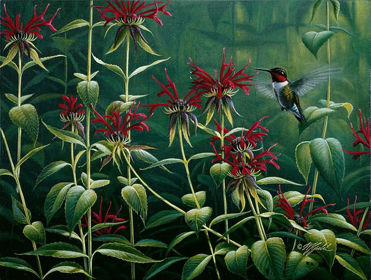Ruby Throat Hummingbird And Monarda Black Ornate Wood Framed Art Print with Double Matting by Goebel, Wilhelm