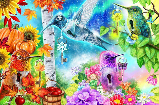 Changing Seasons Humming Birds Black Ornate Wood Framed Art Print with Double Matting by Sheena Pike Art