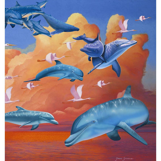 Dolphins Clouds Black Modern Wood Framed Art Print by Stevenson, Graeme